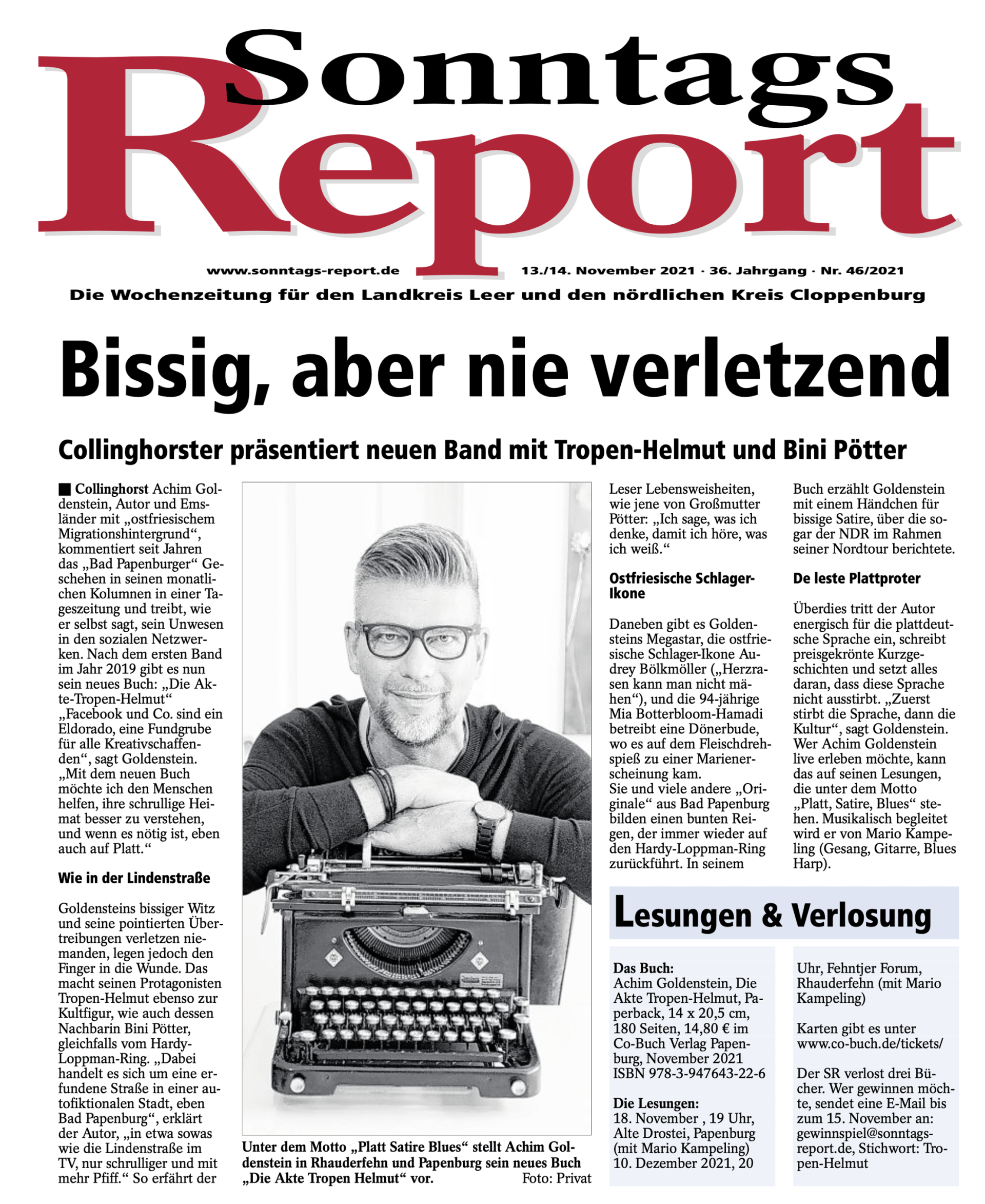 „Tropen-Helmut: Streifzüge durch Bad Papenburg“ sind eine Reihe plattdeutscher Geschichten abgedruckt, auch die, mit der er 2017 den ersten Preis des renommierten NDR-Wettbewerbs „Vertell doch mal“ gewann. In